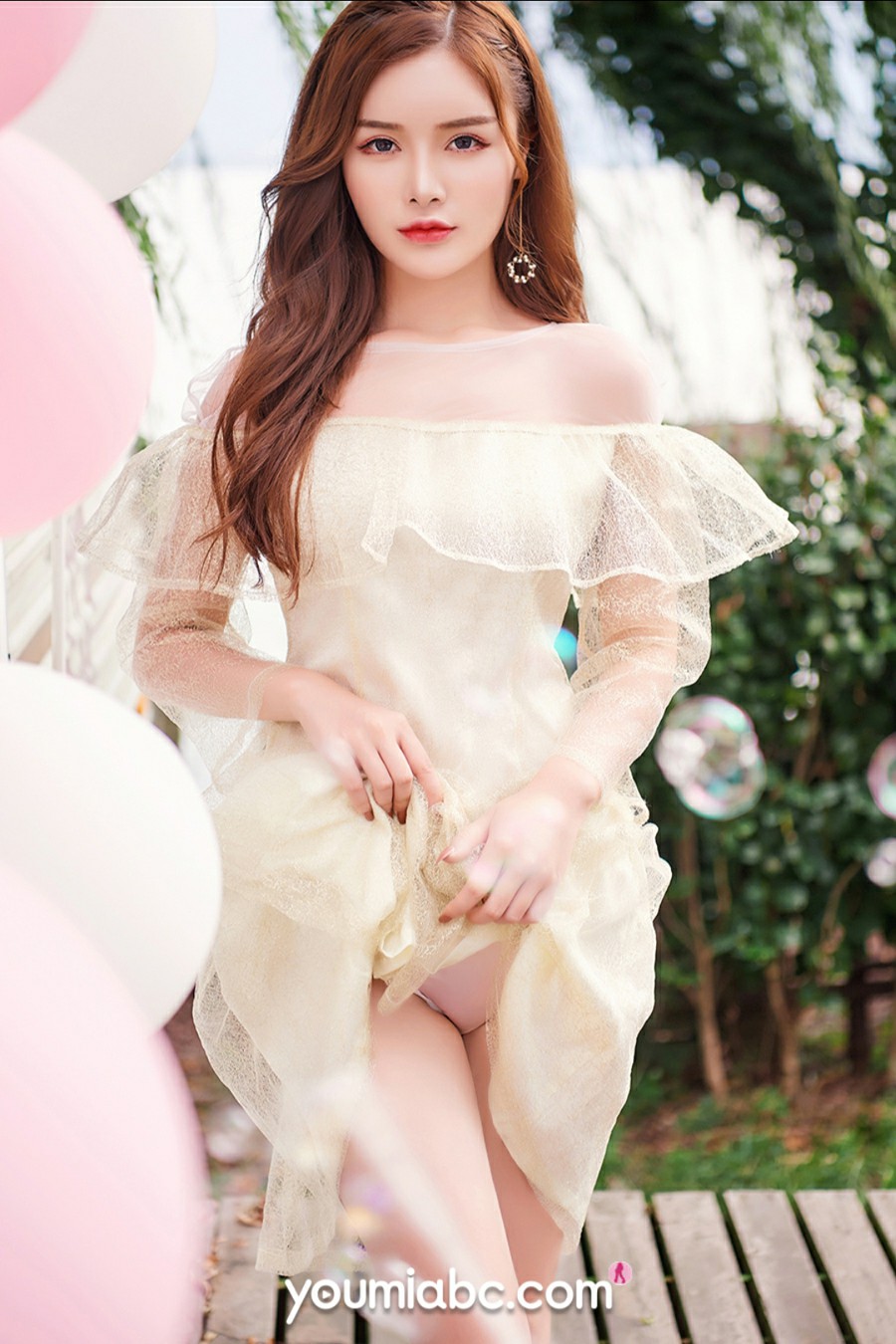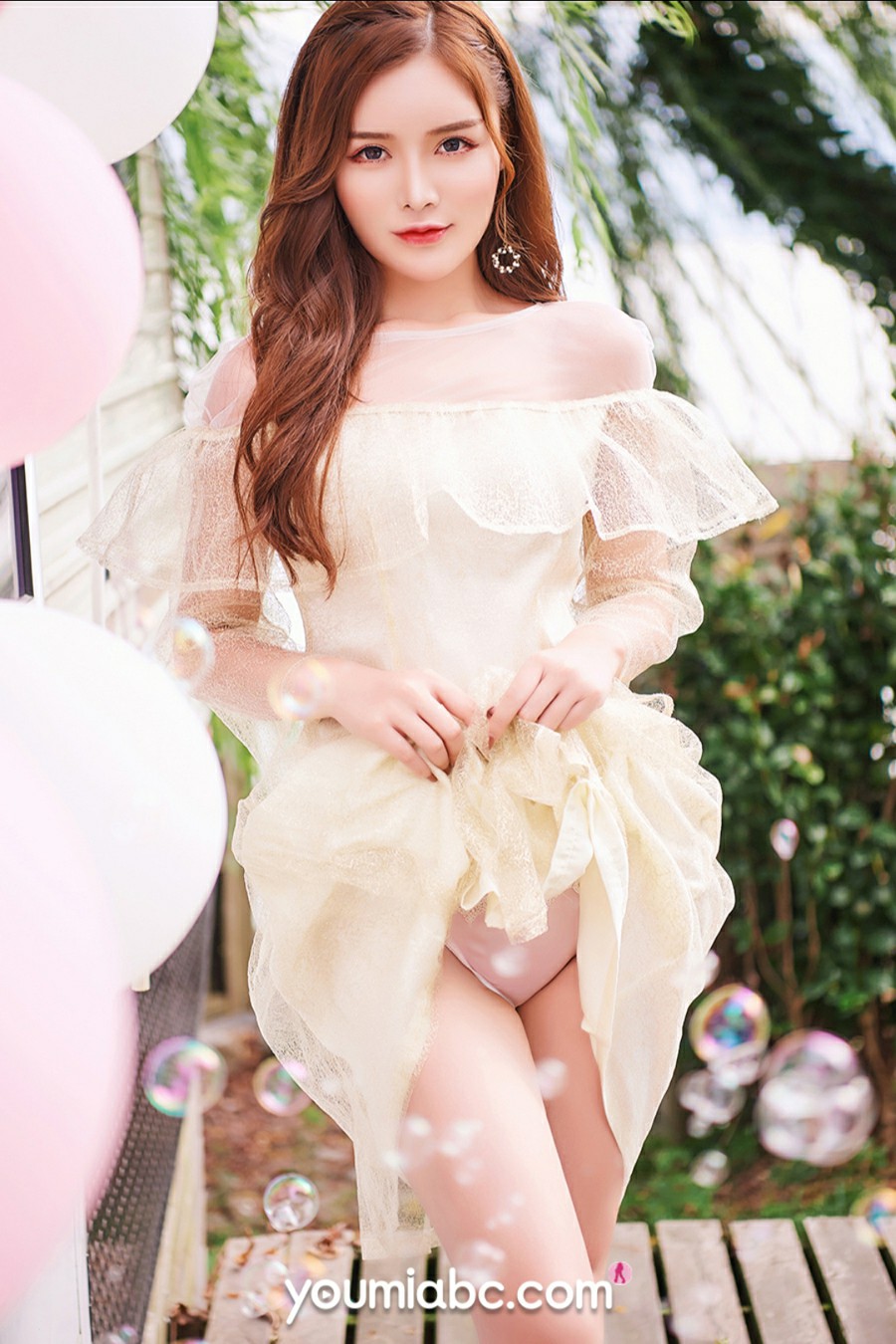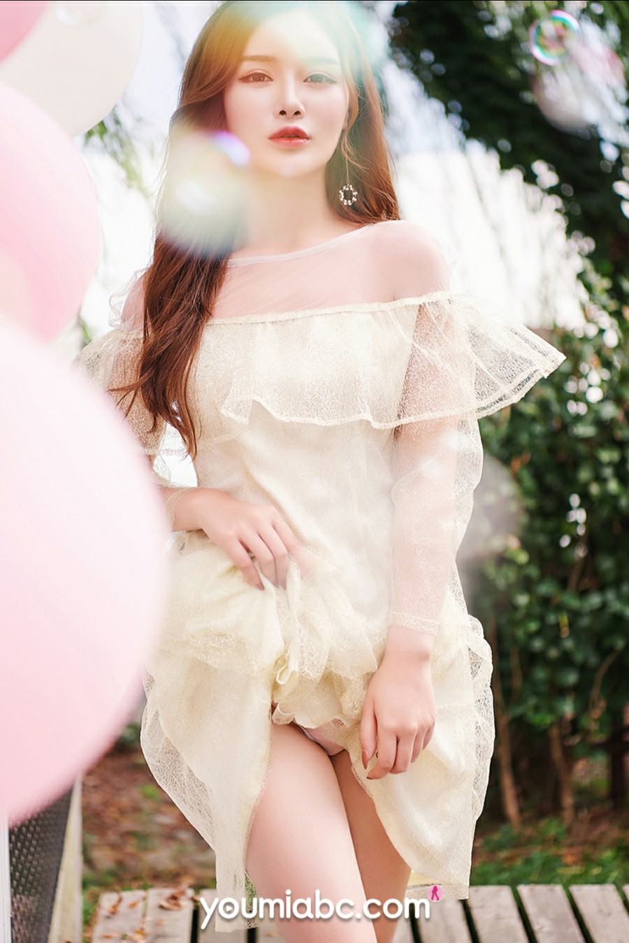粉色,总会给空气增添一抹甜蜜的气息。女孩拿着粉色气球在庭院内露着两条洁白粉嫩的大长腿,赞一句:好一个娇俏惹人的尤物啊!