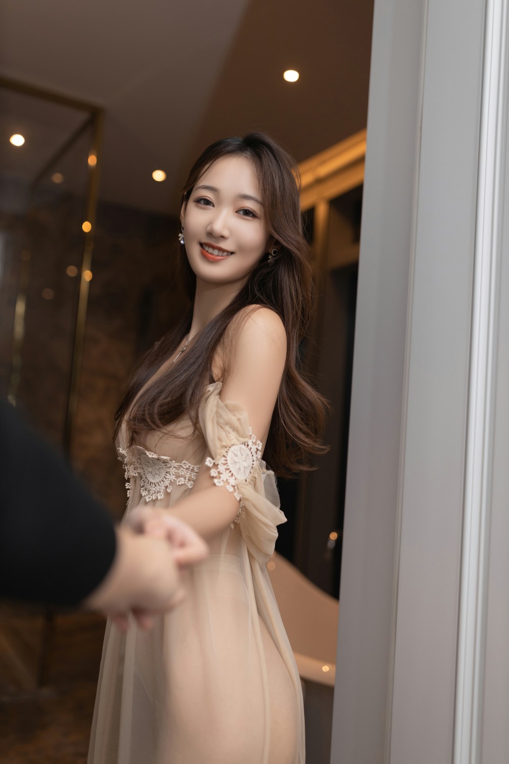 性感浅黄色薄纱轻透连衣长裙搭配诱人原色丝袜,清甜笑容曼妙身姿梦幻入魂,绝美身材一览无余