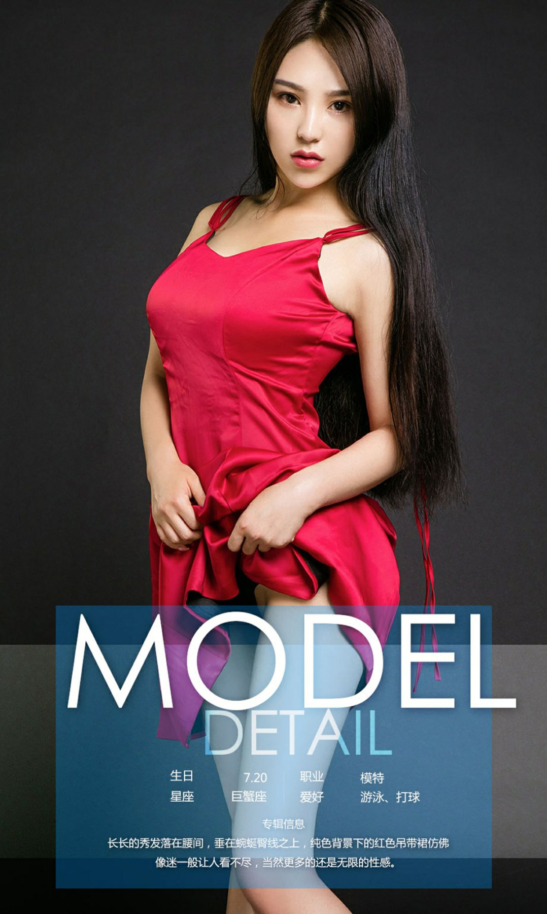 长长的秀发落在腰间,垂在蜿蜒臀线之上,纯色背景下的红色吊带裙仿佛像迷一般让人看不尽,当然更多的还是无限的性感。